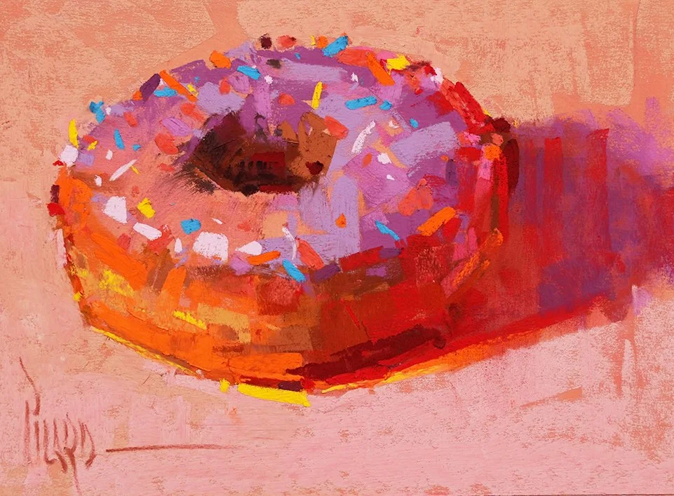 Look at these two paintings of the same pink donut. Exact same subject and composition. The only difference is the light source. A warm light produces a rich, glowing, orange-red painting. A cool light transforms the same donut into a soft, blue-violet one. The subject didn't change. The light did. I couldn't resist putting my own bold spin on them.
